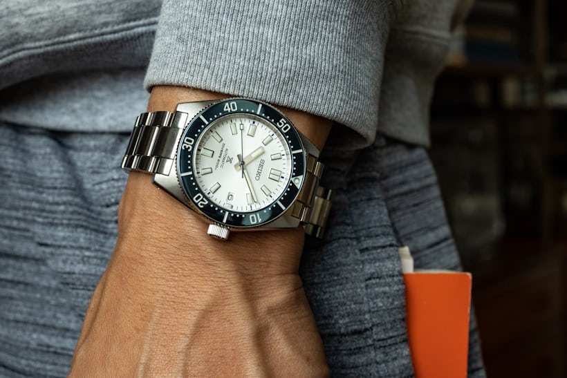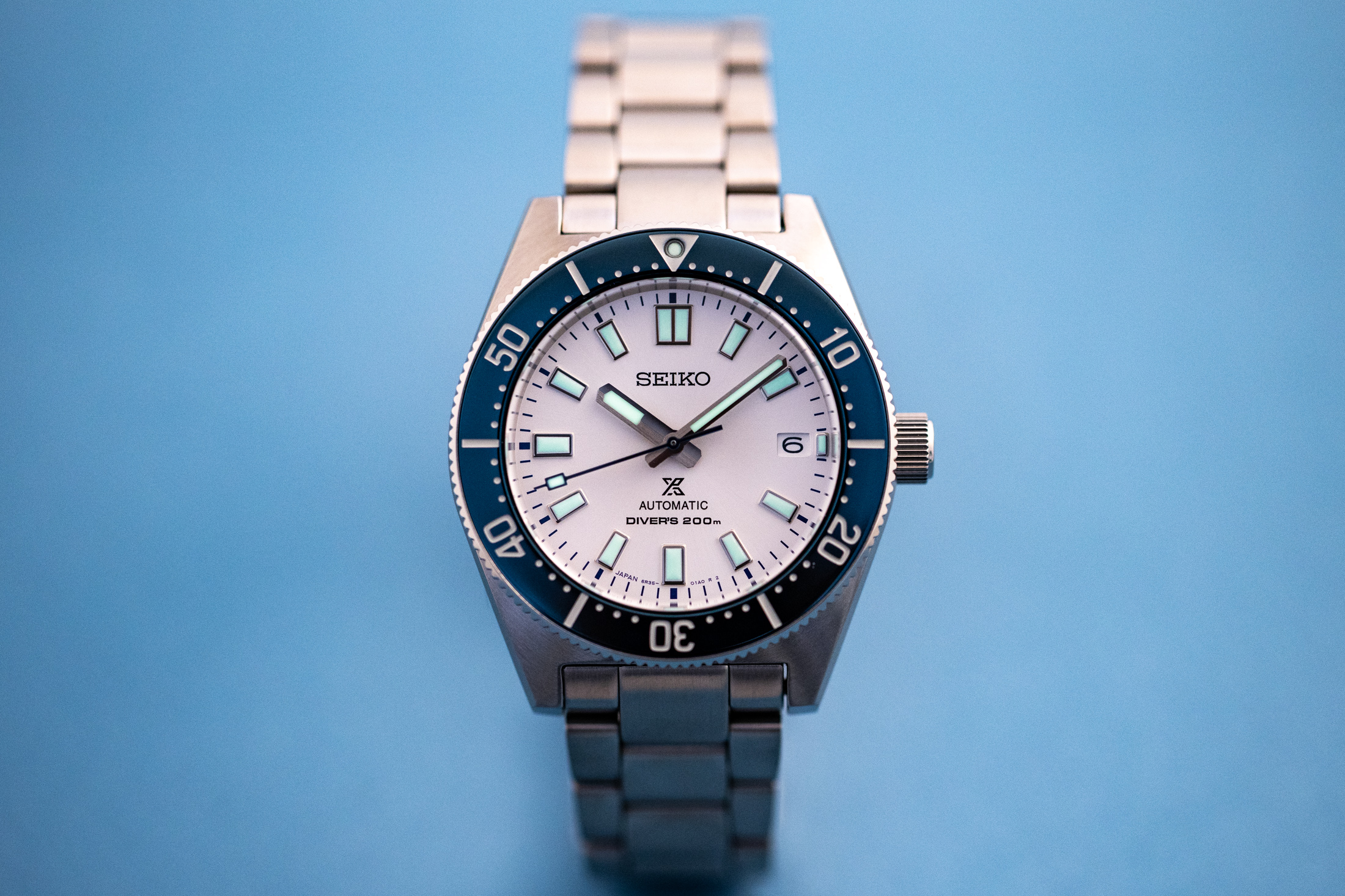 Apart from the bezel and the dial, the rest remains unchanged from the SPB14X series of last year: 40.5mm steel case, 6R35 automatic movement, the drilled lugs, and a full steel bracelet. Speaking of the bezel, while the standard models have uncommon brushed steel inserts, the SPB213 appears to use a different material. I have reached out to Seiko to confirm what material has been used as it looks more smooth and shinier than the brushed finish of the SPB143 Update: Confirmed by Seiko – the SPB213 uses the same bezel construction as the SPB143, a brushed steel bezel and insert that has a surface hardening treatment. Compared to the greys, blacks, and browns of the original lineup, the SPB213 is in literally stark contrast, and while I do wish that the hands and markers had black surrounds, the dial looks really good in white. As for the bezel, the blue looks bright but not shiny which I think is a wise decision for the watch's straightforward and toolish vibe.